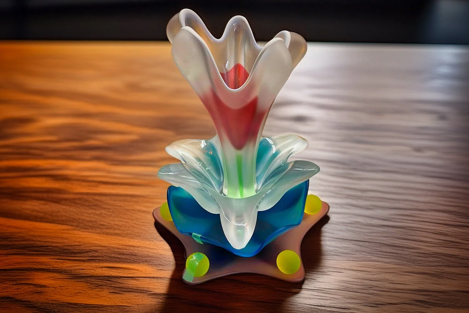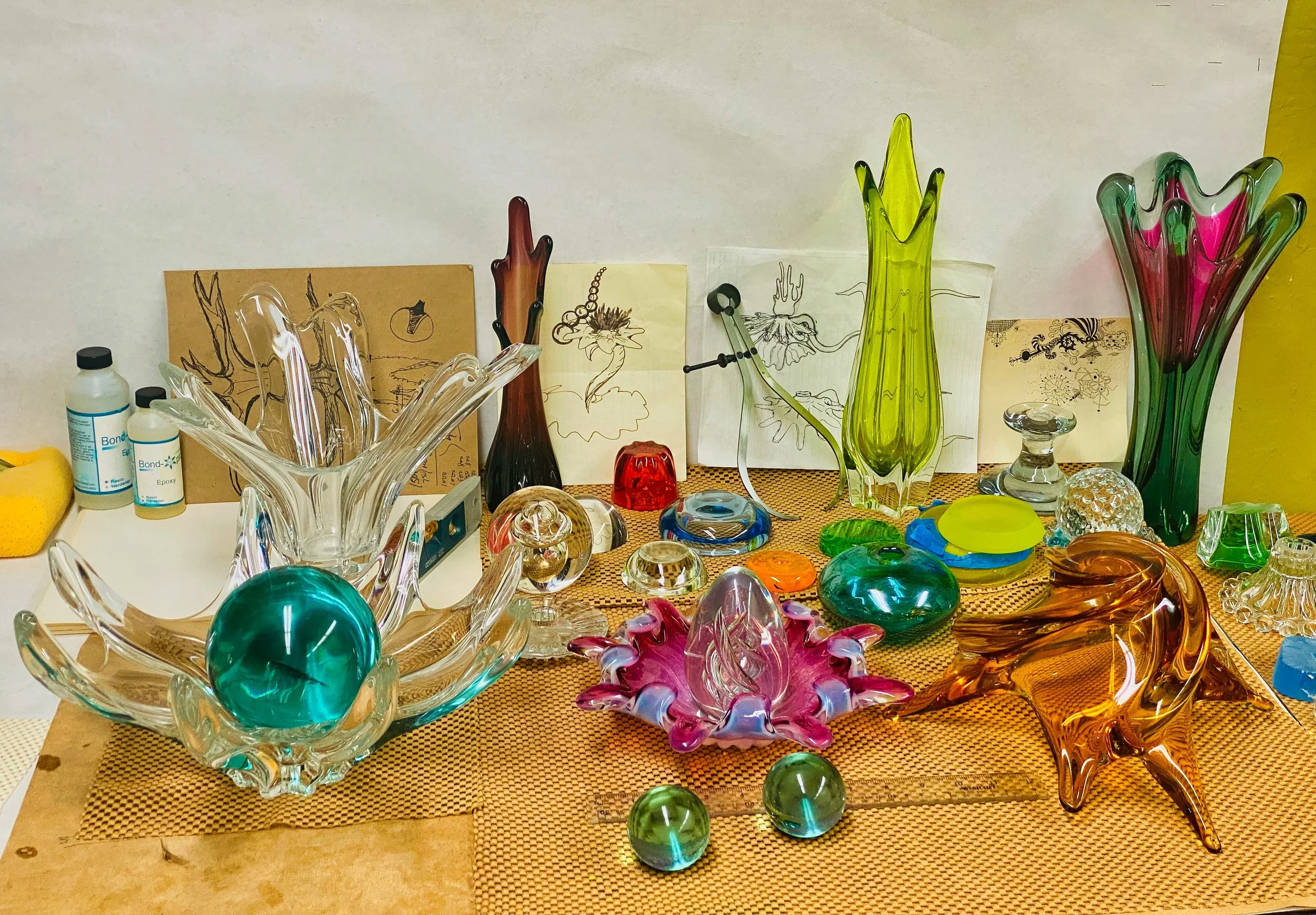 Cosmoplasm centerpieces and commissions for freestanding sculptures are welcomed with the guideline that the work is built primarily with found glass components. This means, like all of the StarSentients, each will always be a new, one-of-a-kind creation.